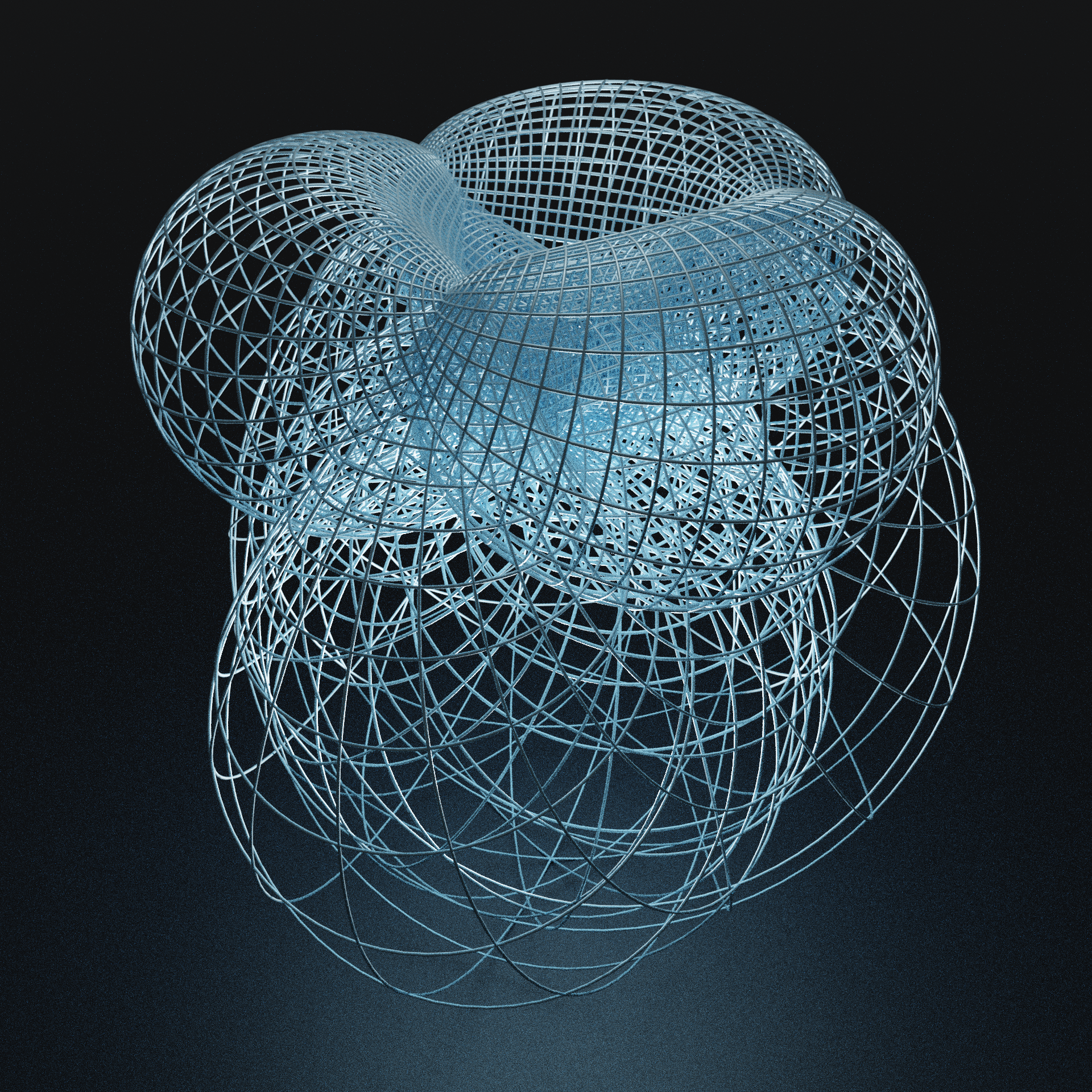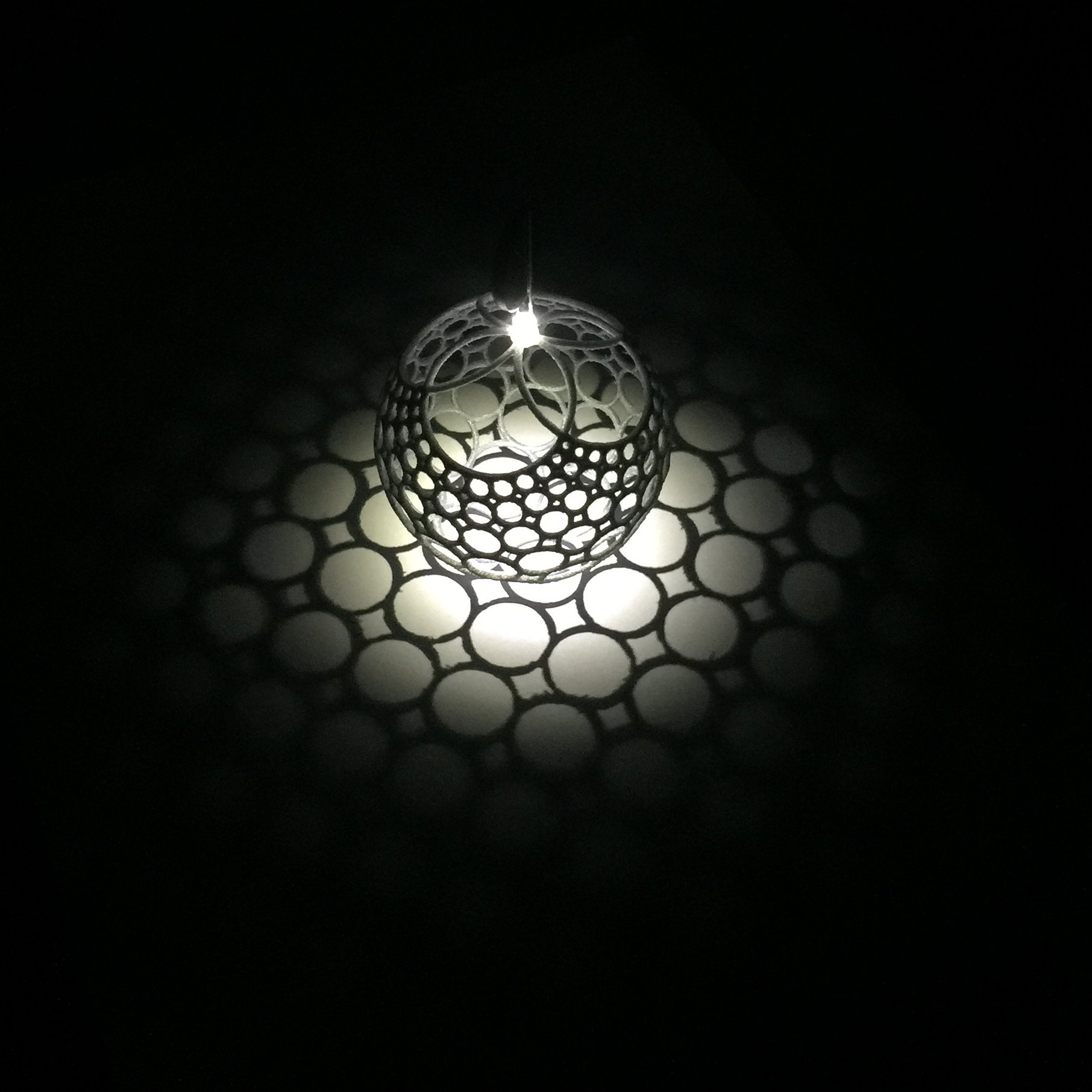A 3d printed circle pattern on the sphere, that stereographically projects to the regular pattern in the plane. This can be seen as the shadow of the circles under a point light at the northpole is exactly the stereographic projection.